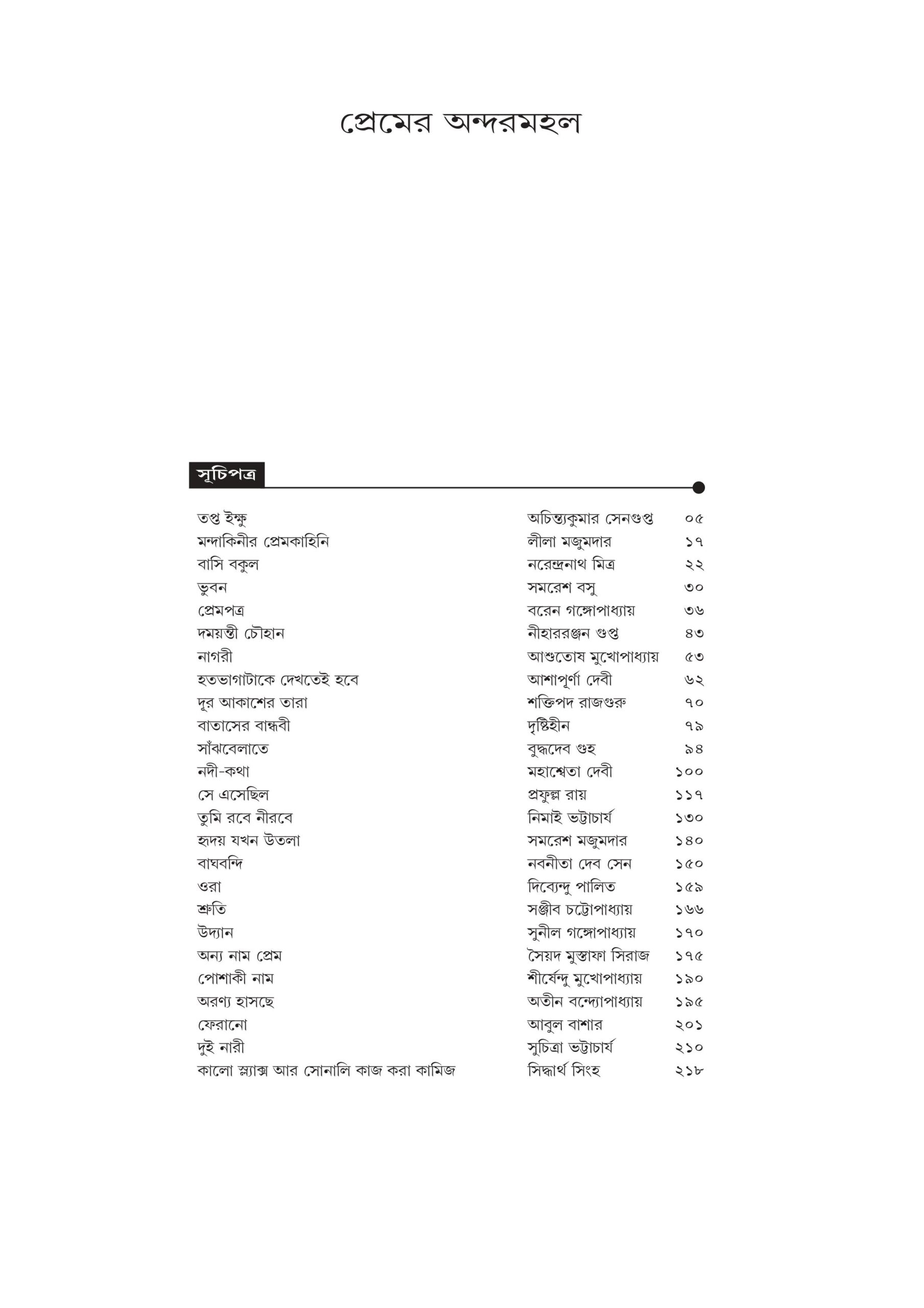 An inside, emotional & secret love story is written by the most popular writers of Bengali literature. Starting from Mahasweta Devi, Prafulla Ray, Samaresh Majumder, and many more. A collection to keep for every book lover.
